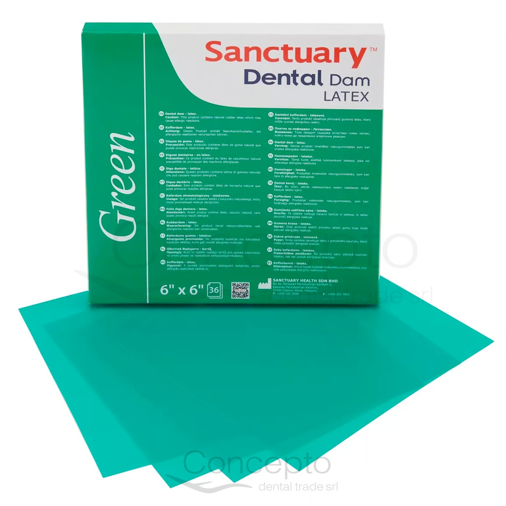 Primer dique dental de látex libre de polvo y bajo en proteínas.